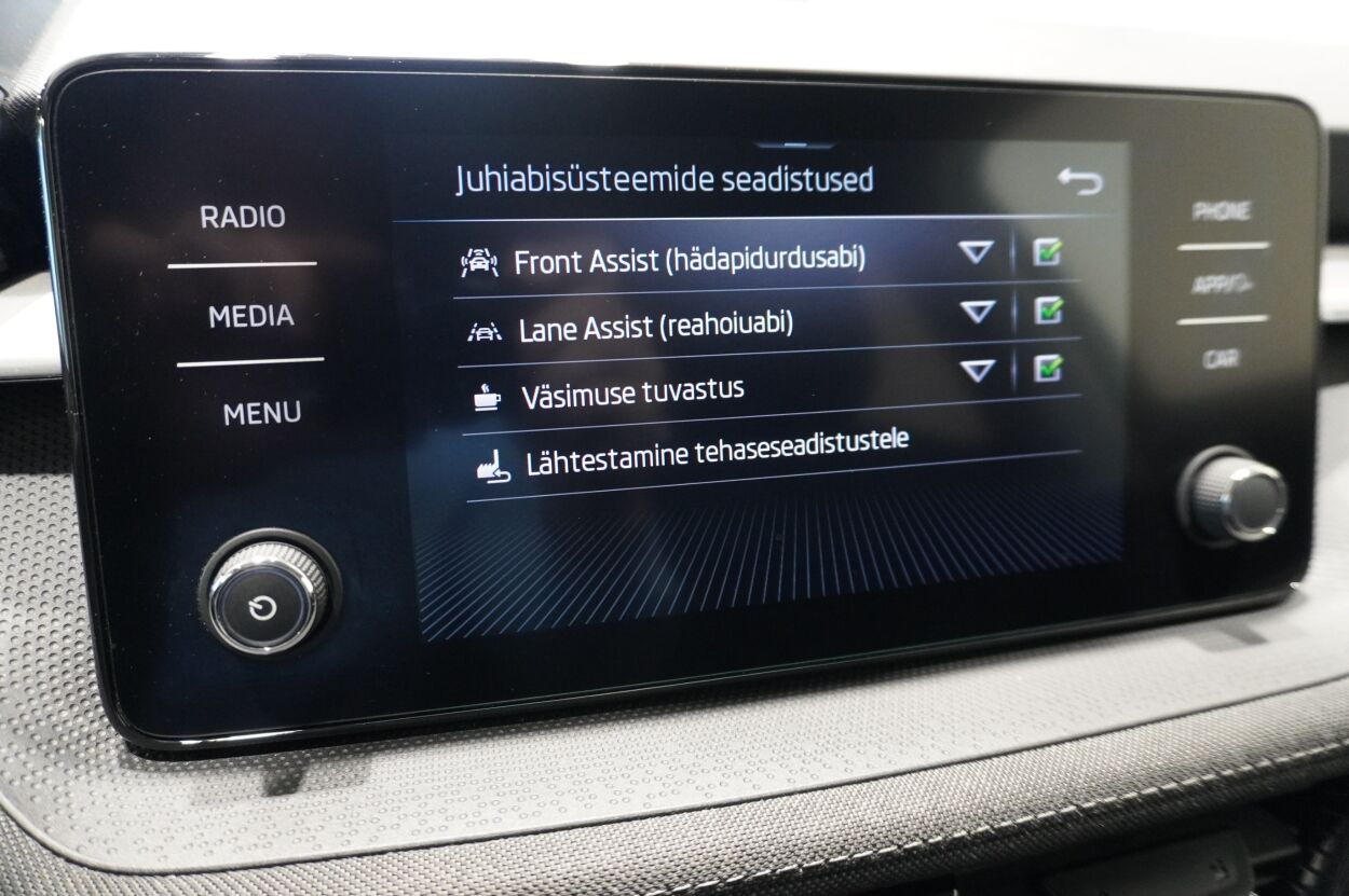 Varustus | automaatpidurdussüsteem, kliimaautomaatik, roolivõimendi (kiirustundlik), kesklukustus (puldiga), ABS pidurid, turvapadi, immobilisaator, signalisatsioon (kaldeanduriga, mahuanduriga), lisapidurituli, stabiilsuskontroll, kokkupõrget ennetav pidurisüsteem, pidurdusjõukontroll, sõiduraja hoidmise abisüsteem, veojõukontroll, vihmasensor, ISOFIX lasteistme kinnitus (ees, taga), kõrvalistuja turvapadja väljalülitamise võimalus, juhi väsimuse tuvastamise süsteem, udutuled (eesmised, tagumine), LED (päevatuled, tagatuled), päevasõidutulede automaatne lülitus, suverehvid, valuveljed, autoga antakse kaasa (talverehvid (naastrehvid)), rehvirõhu kontrollsüsteem, reguleeritav roolisammas (kõrgus ja sügavus), multifunktsionaalne rool, nahkkattega rool, soojendusega rool, stereo (USB pesaga, originaal), kõlarid, Apple CarPlay, Android Auto, ekraan (ees), autokompuuter, käed vabad süsteem, iluliistud salongis, taskud esiistmete seljatugedes, jalamatid (tekstiilist), topsihoidjad (ees, taga), nahkkattega käigukanginupp, nahkkattega käsipidurikang, tekstiilpolster, istmed reguleeritava kõrgusega (juhiiste, kõrvalistuja iste), istmesoojendused, käetugi ees (laekaga), käetugi taga, tagaistme seljatugi allaklapitav, elektrilised välispeeglid (soojendusega), elektrilised akende tõstukid, toonitud klaasid, püsikiiruse hoidja, kohtvalgustid, parkimisandurid (taga), Coming-/Leaving-Home funktsioon, tagavararatas, võtmeta käivitus, start-stopp süsteem, 12v pistikupesad, reisiarvesti, pagasikate, tagaklaasi soojendus, välistemperatuuri näidik, esi- ja tagarataste porikummid, tagaklaasi puhasti |