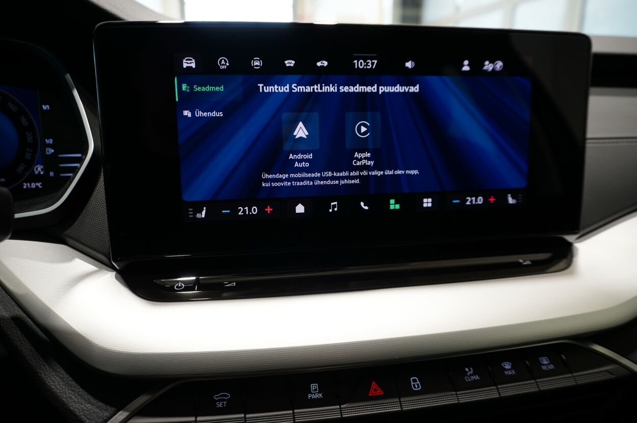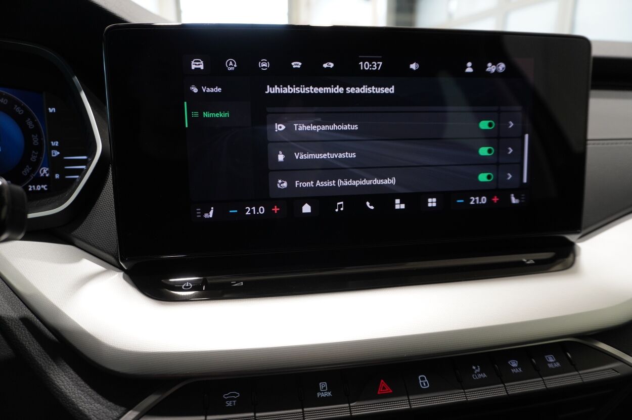 | Varustus | kliimaautomaatik, automaatpidurdussüsteem, roolivõimendi (kiirustundlik), kesklukustus (puldiga), ABS pidurid, elektrooniline seisupidur, turvapadi, turvakardinad, immobilisaator, signalisatsioon (kaldeanduriga, mahuanduriga), lisapidurituli, stabiilsuskontroll, kokkupõrget ennetav pidurisüsteem, sõiduraja hoidmise abisüsteem, pidurdusjõukontroll, liiklusmärkide tuvastus ja kuvamine, veojõukontroll, vihmasensor, ISOFIX lasteistme kinnitus (ees, taga), automaatne paigalseismise funktsioon / mägistardi abi, kõrvalistuja turvapadja väljalülitamise võimalus, juhi väsimuse tuvastamise süsteem, udutuled (tagumine), LED (päevatuled, tagatuled, lähituled, kaugtuled), päevasõidutulede automaatne lülitus, kaugtulede ümberlülitamise assistent, suverehvid, valuveljed, autoga antakse kaasa (talverehvid), rehvirõhu kontrollsüsteem, reguleeritav roolisammas (kõrgus ja sügavus), multifunktsionaalne rool, nahkkattega rool, soojendusega rool, käiguvahetus roolilt, stereo (USB pesaga, originaal), kõlarid, Apple CarPlay, Android Auto, ekraan (ees), autokompuuter, käed vabad süsteem, iluliistud salongis, taskud esiistmete seljatugedes, jalamatid (tekstiilist, kummist), topsihoidjad (ees, taga), tekstiilpolster, istmed reguleeritava kõrgusega (juhiiste, kõrvalistuja iste), istmesoojendused, käetugi ees (laekaga), käetugi taga, tagaistme seljatugi allaklapitav, elektrilised välispeeglid (soojendusega, kokkuklapitavad), elektrilised akende tõstukid, toonitud klaasid, püsikiiruse hoidja, peeglid päikesesirmides, kohtvalgustid, parkimisandurid (ees, taga), parkimiskaamera, Coming-/Leaving-Home funktsioon, digitaalne näidikutepaneel, tagavararatas, võtmeta avamine, võtmeta käivitus, start-stopp süsteem, 12v pistikupesad, reisiarvesti, pakiruumi avamine elektriliselt (puldist), pagasikate, kaubakinnituse konksud, elektrilise soojendusega esiklaas, tagaklaasi soojendus, välistemperatuuri näidik, esi- ja tagarataste porikummid, 17" valuveljed Mensa Aero, rehvid 205/55 R17, Varuratas terasveljel, rehv 205/60 R16, 2-kodaraga soojendusega nahkrool raadio ja telefoni juhtimise ning DSG käiguvahetusega roolilt, Soojendusega esiklaas (integreeritud soojenduskile), Tagastange kaitsekleebis, Täis kütusepaak |