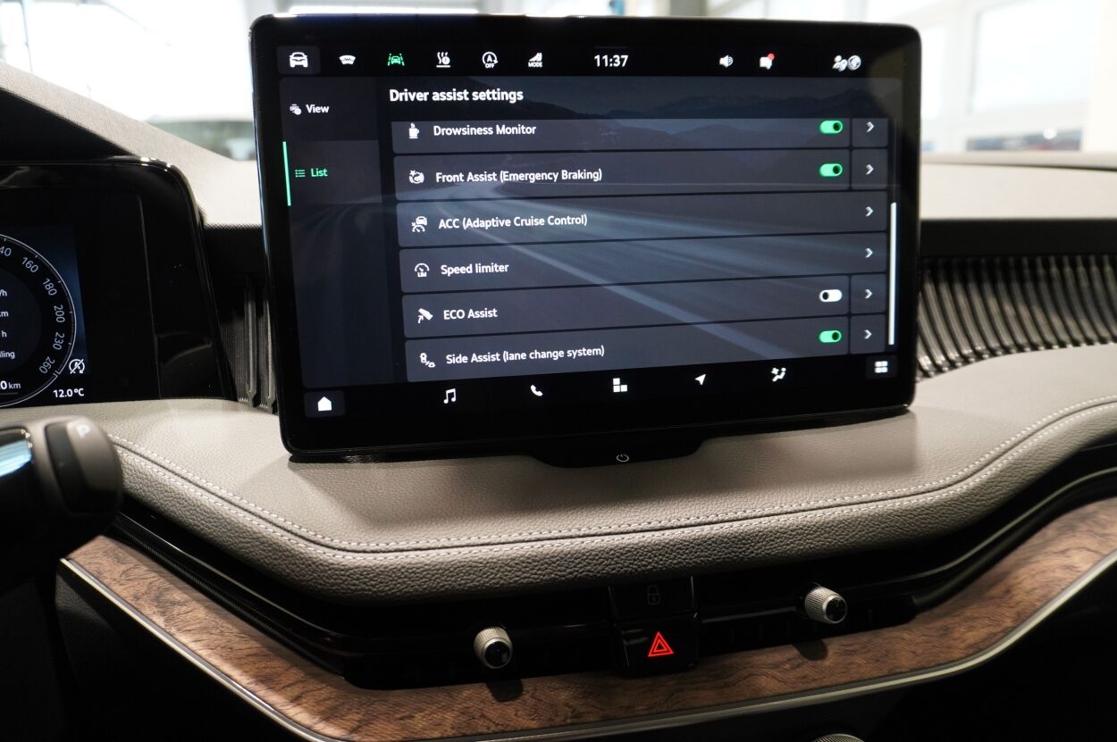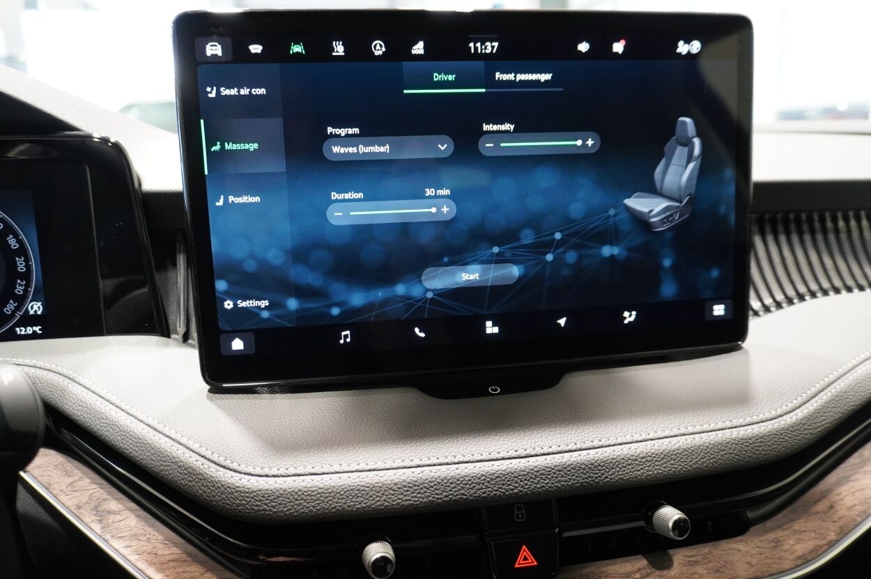 | Varustus | automaatpidurdussüsteem, kliimaautomaatik, roolivõimendi (kiirustundlik), kesklukustus (puldiga), ABS pidurid, turvapadi, elektrooniline seisupidur, turvakardinad, immobilisaator, signalisatsioon (kaldeanduriga, mahuanduriga), lisapidurituli, stabiilsuskontroll, kokkupõrget ennetav pidurisüsteem, pidurdusjõukontroll, sõiduraja hoidmise abisüsteem, liiklusmärkide tuvastus ja kuvamine, pimenurga hoiatus, veojõukontroll, turvavööde eelpingutid esiistmetel, vihmasensor, ISOFIX lasteistme kinnitus (ees, taga), automaatne paigalseismise funktsioon / mägistardi abi, kõrvalistuja turvapadja väljalülitamise võimalus, juhi väsimuse tuvastamise süsteem, valgustuspakett, udutuled (tagumine), LED (päevatuled, tagatuled, lähituled, kaugtuled), esitulede pesurid, päevasõidutulede automaatne lülitus, kaugtulede ümberlülitamise assistent, talverehvid (lamellrehvid), valuveljed, autoga antakse kaasa (suverehvid), rehvirõhu kontrollsüsteem, reguleeritav roolisammas (kõrgus ja sügavus), multifunktsionaalne rool, nahkkattega rool, soojendusega rool, käiguvahetus roolilt, stereo (USB pesaga, originaal), helivõimendi, kõlarid, Apple CarPlay, Android Auto, ekraan (ees), navigatsiooniseade (kaardiga), autokompuuter, käed vabad süsteem, iluliistud salongis (puitdekoor), taskud esiistmete seljatugedes, jalamatid (tekstiilist), pagasiruumi matt, topsihoidjad (ees, taga), nahkpolster, 2x elektriliselt reguleeritavad istmed (2x mäludega), istmed reguleeritava kõrgusega (juhiiste, kõrvalistuja iste), 4x istmesoojendused, reguleeritava kumerusega seljatugi (juhiiste, kõrvalistuja iste), massaažifunktsiooniga istmed (juhil, kõrvalistmel), ventileeritavad istmed (ees), käetugi ees (laekaga), käetugi taga, tagaistme seljatugi allaklapitav, Comfort istmed, elektrilised välispeeglid (soojendusega, kokkuklapitavad), elektrilised akende tõstukid, toonitud klaasid, püsikiiruse hoidja (eessõitjaga distantsi hoidev), peeglid päikesesirmides, 2x rulookardinad ustel, mootori eelsoojendus, salongi eelsoojendus, kohtvalgustid, parkimisandurid (ees, taga), parkimiskaamera, Coming-/Leaving-Home funktsioon, digitaalne näidikutepaneel, info kuvamine esiklaasile, telefoni juhtmevaba laadimine, tagavararatas, võtmeta avamine, võtmeta käivitus, start-stopp süsteem, 12v pistikupesad, reisiarvesti, paigaldatud tulekustuti, pakiruumi avamine elektriliselt (puldist), pagasikate, kaubakinnituse konksud, elektrilise soojendusega esiklaas, tagaklaasi soojendus, välistemperatuuri näidik, esi- ja tagarataste porikummid, Pakett Family&Business: spetsiaalsed peatoed teises istmereas, rulookardinad tagumistel külgakendel ja tagaaknal, külgturvapadjad taga, tahvelarvuti hoidik, Kaugjuhtimisega seisuküte, Škoda Navigation Plus: esiklaasinäidik Head Up Display, 13" puutetundlik värviekraan, navigatsioonisüsteem, FM raadio, |